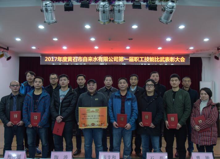 大會由公司副總經理、工會主席張建華主持,公司總經理張昌銳宣讀《關于2017年度公司第一屆職工技能比武的表彰決定》,在頒獎音樂聲中,“運行值班工”、“維修電工”工種前三名選手依次上臺領獎,其中每個工種的第一名石磊、陶濤獲得“崗位能手”榮譽稱號,張支和榮獲“優(yōu)秀師傅”,花湖水廠獲得“優(yōu)秀組織單位”。