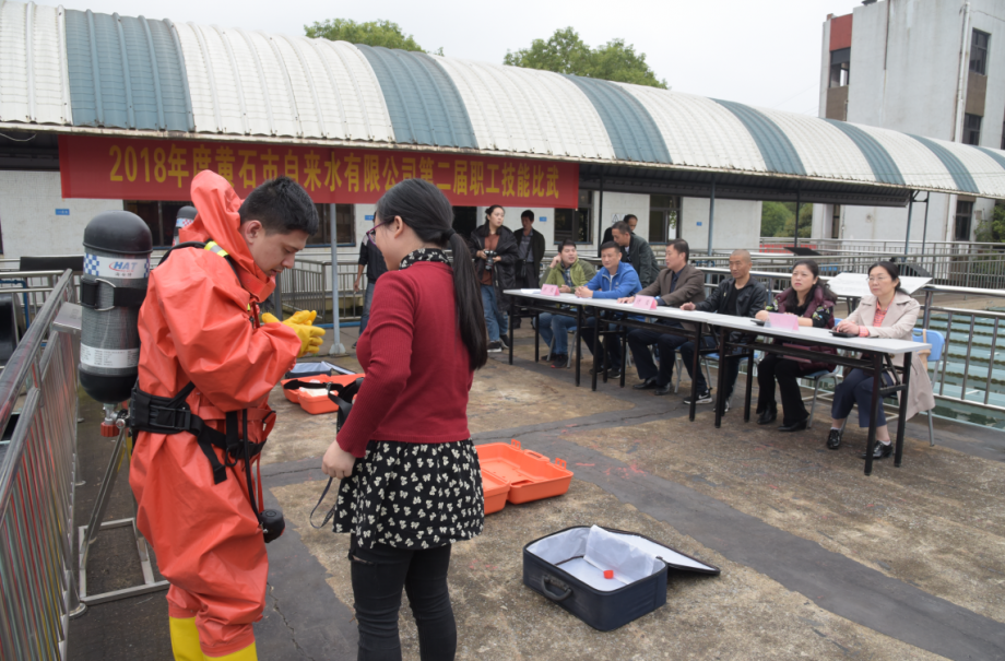 當(dāng)天上午,首先在公司二樓會議室舉行了“職工技能比武”理論考試。公司領(lǐng)導(dǎo)高度重視,現(xiàn)場巡視??荚囘^程中,參考人員和監(jiān)考人員嚴(yán)格遵守考試紀(jì)律,參考人員答題認真,監(jiān)考人員監(jiān)考嚴(yán)格。在下午的實操考試中,共分為運行值班工比賽、維修電工比賽、水質(zhì)檢驗工比賽以及防化服穿戴等四個項目。其中,水質(zhì)檢驗工比賽主要測試職工水質(zhì)檢驗工基本理論知識和水質(zhì)日常檢測七項、九項指標(biāo)基礎(chǔ)理論知識。維修電工比賽需根據(jù)安全技術(shù)操作規(guī)程完成試題要求。運行值班工比賽以現(xiàn)場答題的方式,回答評委提出的問題。防化服穿戴比賽,要求兩人一組相互配合,根據(jù)防化服穿戴規(guī)范程序在規(guī)定的時間內(nèi)正確完成穿戴。