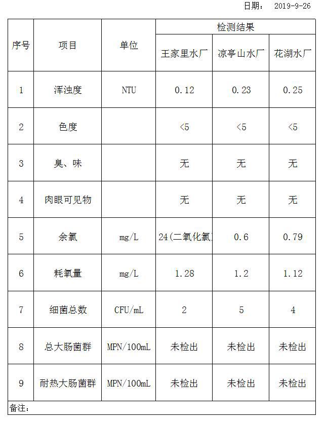 2019年9月26日出廠水項(xiàng)目監(jiān)測(cè)結(jié)果