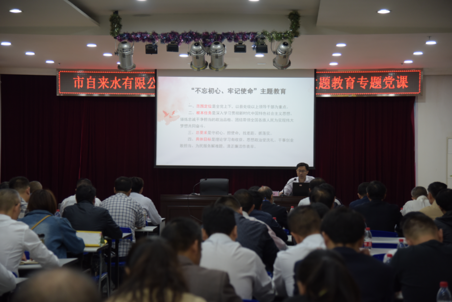 余曦提到,在新時代的背景下,國企黨員應將理論與實踐結合,對初心和使命尋根問本,扎實做到信念、政治、責任、能力、作風“五個過硬”,以“不忘初心、牢記使命”的政治清醒,全力做好新時代供水工作。公司黨委副書記、總經理張昌銳主持并強調,公司各單位主要領導干部作為關鍵少數,要通過集中學習的形式,領悟主題教育的重大意義,引導廣大黨員不折不扣貫徹落實相關要求,確保主題教育扎實推進,取得實質成效。公司領導班子成員、各基層單位班子成員及機關全體黨員近100人參加。