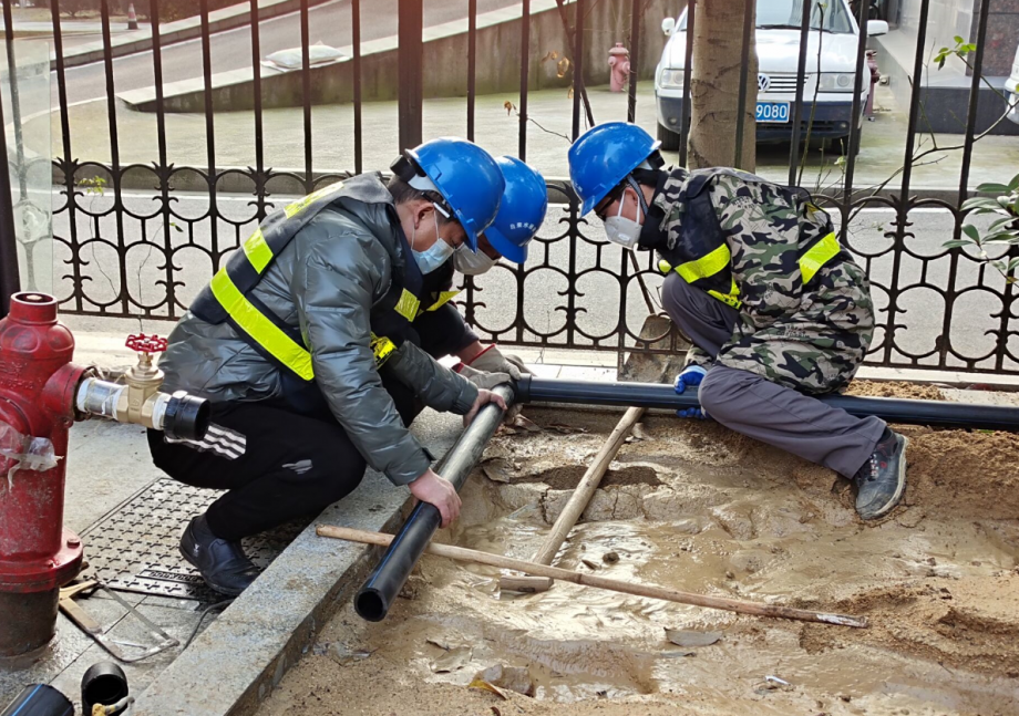 在抗擊疫情特殊時(shí)期,公司克服材料采購、車輛調(diào)度、人員安排等困難,特事特辦,當(dāng)天便迅速安排公司客服中心、設(shè)計(jì)公司以及建設(shè)工程公司相關(guān)負(fù)責(zé)人趕赴現(xiàn)場,進(jìn)行勘測設(shè)計(jì)、制定方案并組織材料施工,僅5小時(shí)便完成外部供水管道敷設(shè),具備了通水條件。