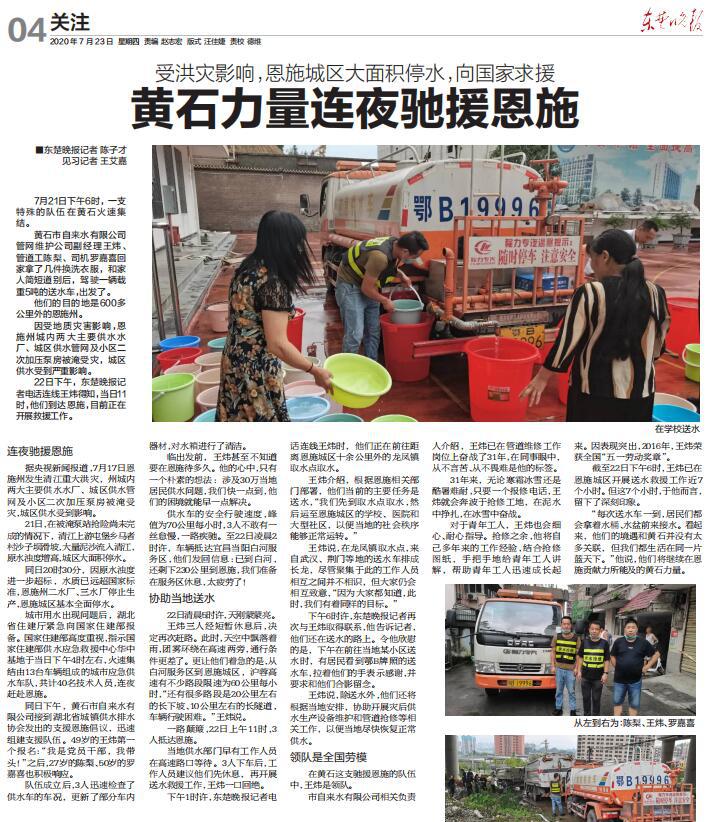 市自來(lái)水有限公司派專(zhuān)人支援恩施水司的舉動(dòng)得到了《東楚晚報(bào)》記者關(guān)注,并于7月23日作了《受洪災(zāi)影響,恩施城區(qū)大面積停水,向國(guó)家求援——黃石力量連夜馳援恩施》專(zhuān)題報(bào)道,引起廣泛關(guān)注和好評(píng)。