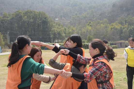 緊接著,女職工們在揉肩捶背、花開花落等熱身破冰運動后,組成5隊進行PK,團建趣味活動內容豐富多彩,既有跳大繩等傳統(tǒng)的體育項目,也有考驗團隊默契配合的“解手鏈”,還有考驗智慧的“算二十四點”。隊員們情緒高漲,各顯神通,使出渾身解數(shù)。整個賽場熱鬧非凡,口號聲、加油聲、吶喊聲、歡笑聲不絕于耳。