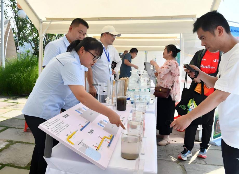 活動(dòng)現(xiàn)場(chǎng),污水公司的工作人員向市民展示了一瓶來(lái)自生活小區(qū)的渾濁污水,并表示經(jīng)過(guò)專業(yè)處理方式,5分鐘后將見(jiàn)證神奇變化。隨著時(shí)間推進(jìn),在工作人員演示下,污水依次經(jīng)歷“進(jìn)水、氧化溝、高效沉淀池”等處理環(huán)節(jié),水質(zhì)逐漸由濁變清,這直觀的過(guò)程引得圍觀市民連連驚嘆,也揭開(kāi)了城市污水處理的科技面紗。